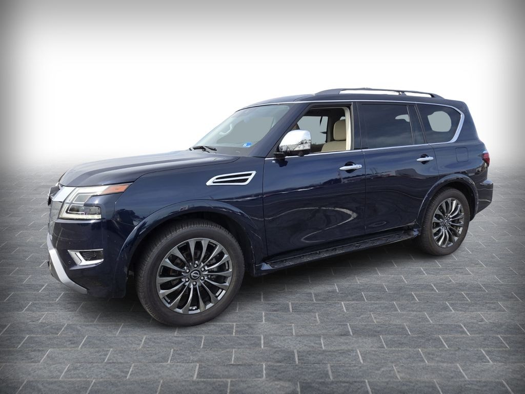 Captain's Chairs Package (2nd Row Captain's Chairs and 2nd Row Center Console w/Padded Armrest), Cargo Package, Nissan Certified Certified, 13 Speakers, 2.937 Axle Ratio, 3rd Row Carpeted Floor Mats - Captain Seat, 3rd row seats: split-bench, 4-Wheel Disc Brakes, ABS brakes, Air Conditioning, Alloy wheels, AM/FM radio: SiriusXM, Anti-whiplash front head restraints, Auto High-beam Headlights, Auto tilt-away steering wheel, Auto-dimming door mirrors, Auto-dimming Rear-View mirror, Auto-leveling suspension, Automatic temperature control, Brake assist, Bumpers: body-color, Climate-Controlled Front Bucket Seats, Delay-off headlights, Driver door bin, Driver vanity mirror, Dual front impact airbags, Dual front side impact airbags, Electronic Stability Control, Emergency communication system: NissanConnect Services, Exterior Parking Camera Rear, Four wheel independent suspension, Front anti-roll bar, Front Bucket Seats, Front Center Armrest, Front dual zone A/C, Front fog lights, Front reading lights, Fully automatic headlights, Garage door transmitter: HomeLink, Heated door mirrors, Heated front seats, Heated rear seats, Heated steering wheel, HVAC memory, Illuminated entry, Illuminated Kick Plates, Illuminated Scuff Plate, Knee airbag, Leather Shift Knob, Leather steering wheel, Low tire pressure warning, Memory seat, Navigation System, Occupant sensing airbag, Outside temperature display, Overhead airbag, Overhead console, Panic alarm, Passenger door bin, Passenger vanity mirror, Power door mirrors, Power driver seat, Power Liftgate, Power moonroof, Power passenger seat, Power steering, Power windows, Quilted Leather Seat Trim, Radio: NissanConnect w/SiriusXM, Rain sensing wipers, Rear air conditioning, Rear anti-roll bar, Rear reading lights, Rear seat center armrest, Rear window defroster, Rear window wiper, Reclining 3rd row seat, Remote keyless entry, Roof Rail Cross Bars - Gun Metal, Security system, Speed control, Speed-sensing steering, Speed-Sensitive Wipers, Split folding rear seat, Spoiler, Steering wheel memory, Steering wheel mounted audio controls, Tachometer, Telescoping steering wheel, Tilt steering wheel, Traction control, Trip computer, Turn signal indicator mirrors, Variably intermittent wipers, Ventilated front seats, Voltmeter, and Wheels: 22" x 8J Machine-Faced w/Tinted Clear Coat.