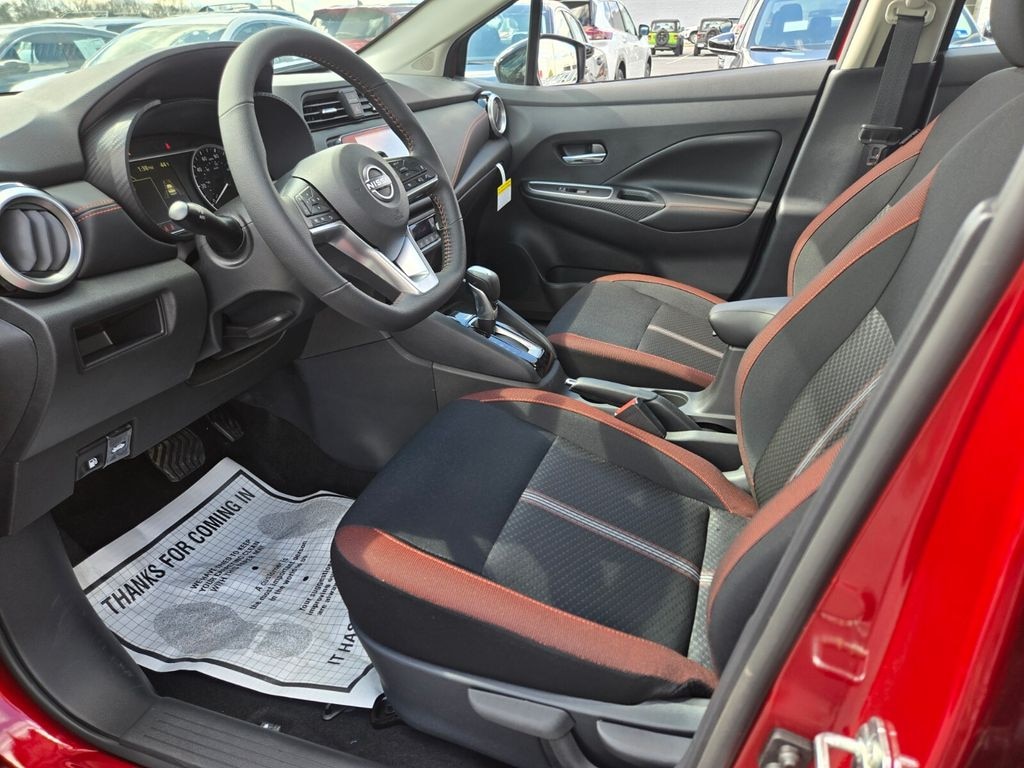 Trunk Package (Shopping Bag Hooks and Trunk Net), 17" Aluminum Alloy Wheels, 6 Speakers, ABS brakes, Air Conditioning, Alloy wheels, AM/FM radio: SiriusXM, Apple CarPlay/Android Auto, Auto High-beam Headlights, Automatic temperature control, Blind Spot Warning, Brake assist, Bumpers: body-color, Carpeted Floor Mats & Trunk Mat (5-Piece Set), Delay-off headlights, Driver door bin, Driver vanity mirror, Dual front impact airbags, Dual front side impact airbags, Electronic Stability Control, Emergency communication system, Front anti-roll bar, Front Bucket Seats, Front Center Armrest, Front reading lights, Front wheel independent suspension, Fully automatic headlights, Heated door mirrors, Heated Front Bucket Seats, Heated front seats, Illuminated entry, Knee airbag, Leather steering wheel, Low tire pressure warning, Occupant sensing airbag, Outside temperature display, Overhead airbag, Panic alarm, Passenger door bin, Passenger vanity mirror, Power door mirrors, Power steering, Power windows, Premium Paint, Radio data system, Radio: AM/FM Audio System, Rear Parking Sensors, Rear side impact airbag, Rear window defroster, Remote keyless entry, Speed control, Splash Guards, Split folding rear seat, Spoiler, SR Fabric Seat Trim, Steering wheel mounted audio controls, Tachometer, Telescoping steering wheel, Tilt steering wheel, Traction control, Trip computer, Turn signal indicator mirrors, and Variably intermittent wipers. Price includes: $750 - Nissan MY25 Bonus Cash. Exp. 03/31/2026